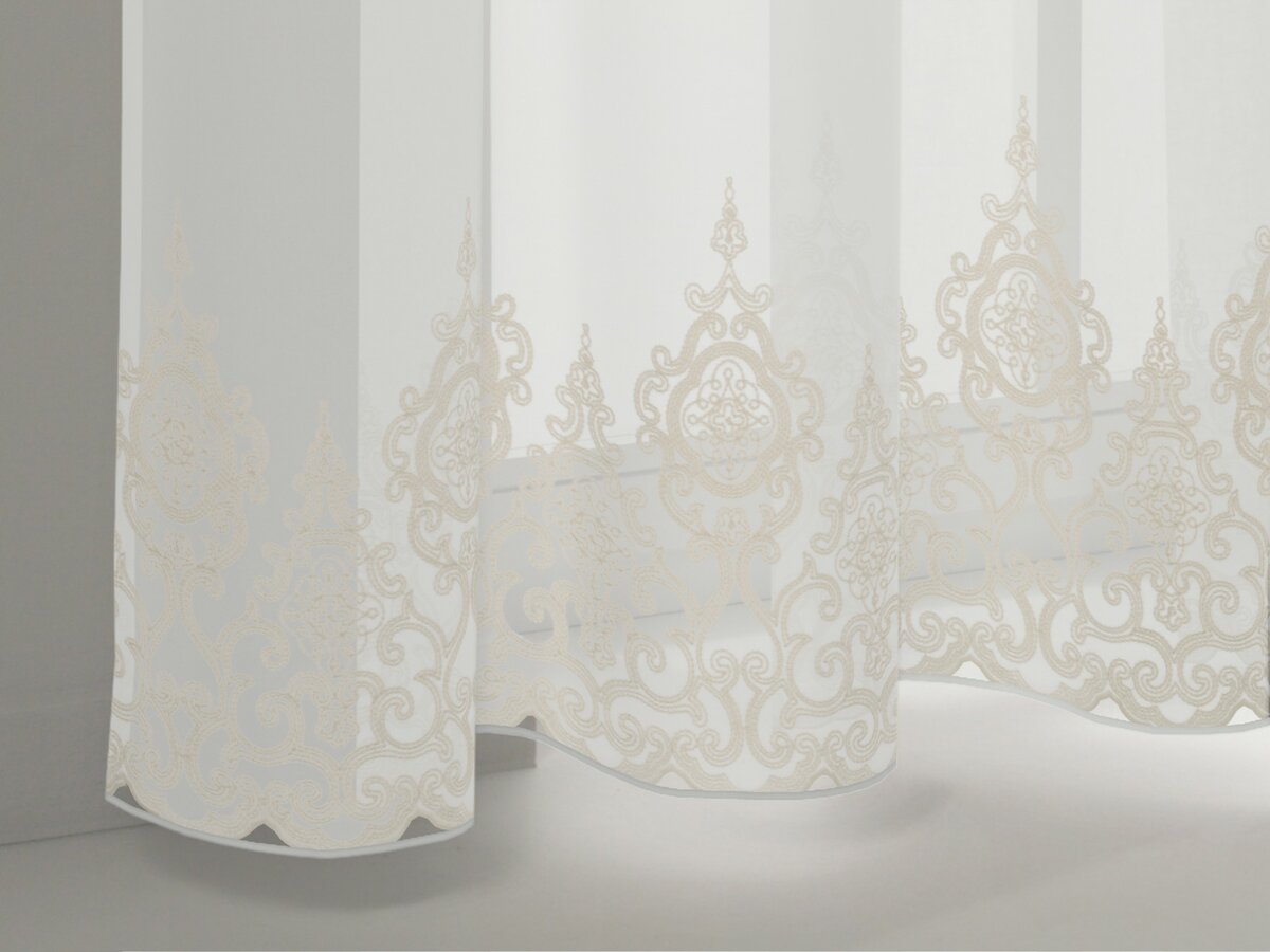 Aufwändiger Inbetween, bei dem die leinenartige Grundware im reizvollen Kontrast zur romantischen Bordürenstickerei mit verspieltem Bogenabschluss steht. Der filigrane Auftritt mit einem Hauch von ländlicher Nostalgie ist in drei dezenten Naturkolorits lieferbar.