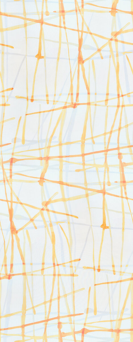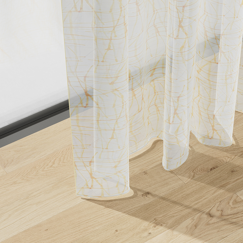 GROOVY groovt! Das grafische Freihanddessin mit wilden Linien und harmonischen Farbverläufen erfrischt in Grün-Aqua, fetzt in Orange- Gelb und besänftigt in Grau-Beige und Creme-Weiß. Permanent schwer entflammbar und permanent schön: die brillante Drucktechnik auf feiner marquisette-artigen Gitterstruktur.