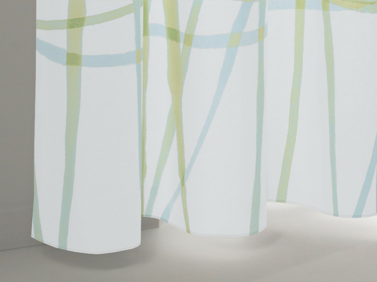 GROOVY groovt! Das grafische Freihanddessin mit wilden Linien und harmonischen Farbverläufen erfrischt in Grün-Aqua, fetzt in Orange- Gelb und besänftigt in Grau-Beige und Creme-Weiß. Permanent schwer entflammbar und permanent schön: die brillante Drucktechnik auf feiner marquisette-artigen Gitterstruktur.