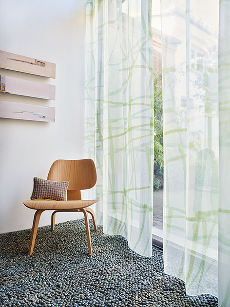 GROOVY groovt! Das grafische Freihanddessin mit wilden Linien und harmonischen Farbverläufen erfrischt in Grün-Aqua, fetzt in Orange- Gelb und besänftigt in Grau-Beige und Creme-Weiß. Permanent schwer entflammbar und permanent schön: die brillante Drucktechnik auf feiner marquisette-artigen Gitterstruktur.