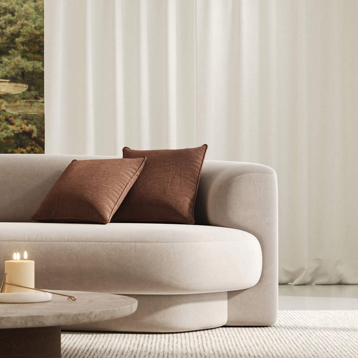 LILA kommt in Pure White, Chalk, Camel, Hazelnut, Sand und Burnt Sienna. Der Inbetween ist ein haptisches Erlebnis in sechs geerdeten Tönen. Megasoft in Griff und Fall, ein Traum zum Dekorieren. Grün ist LILA außerdem, da sie aus 100 % natürlichen Materialien besteht. Die hochwertige Leinenfaser ist ein Natur-Rohstoff, ohne künstliche Bewässerung in Europa angebaut und garantiert frei von Genveränderungen. Auch Lyocell ist komplett biologisch abbaubar und eine der nachhaltigsten Viskosefasern mit tollen Eigenschaften: Die Faser mit glatter Oberfläche und seidigem Griff wärmt nahezu wie Schurwolle und kühlt ähnlich wie Leinen. Da sie mehr Feuchtigkeit aufnimmt als Baumwolle, sorgt sie nebenbei für ein gesundes Raumklima.