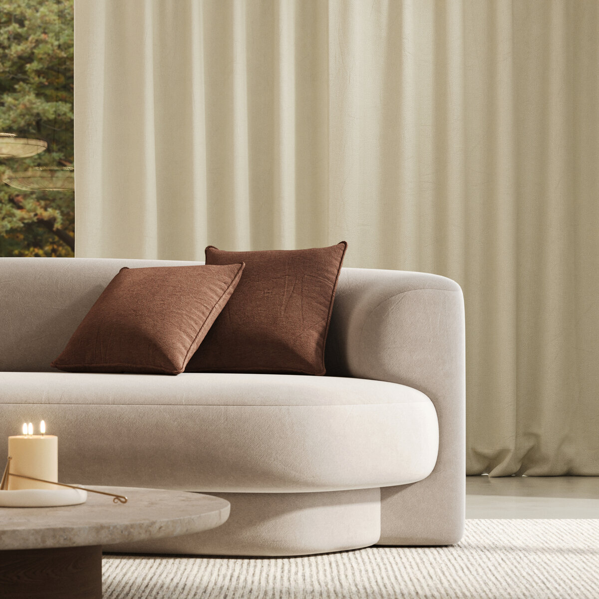 LILA kommt in Pure White, Chalk, Camel, Hazelnut, Sand und Burnt Sienna. Der Inbetween ist ein haptisches Erlebnis in sechs geerdeten Tönen. Megasoft in Griff und Fall, ein Traum zum Dekorieren. Grün ist LILA außerdem, da sie aus 100 % natürlichen Materialien besteht. Die hochwertige Leinenfaser ist ein Natur-Rohstoff, ohne künstliche Bewässerung in Europa angebaut und garantiert frei von Genveränderungen. Auch Lyocell ist komplett biologisch abbaubar und eine der nachhaltigsten Viskosefasern mit tollen Eigenschaften: Die Faser mit glatter Oberfläche und seidigem Griff wärmt nahezu wie Schurwolle und kühlt ähnlich wie Leinen. Da sie mehr Feuchtigkeit aufnimmt als Baumwolle, sorgt sie nebenbei für ein gesundes Raumklima.
