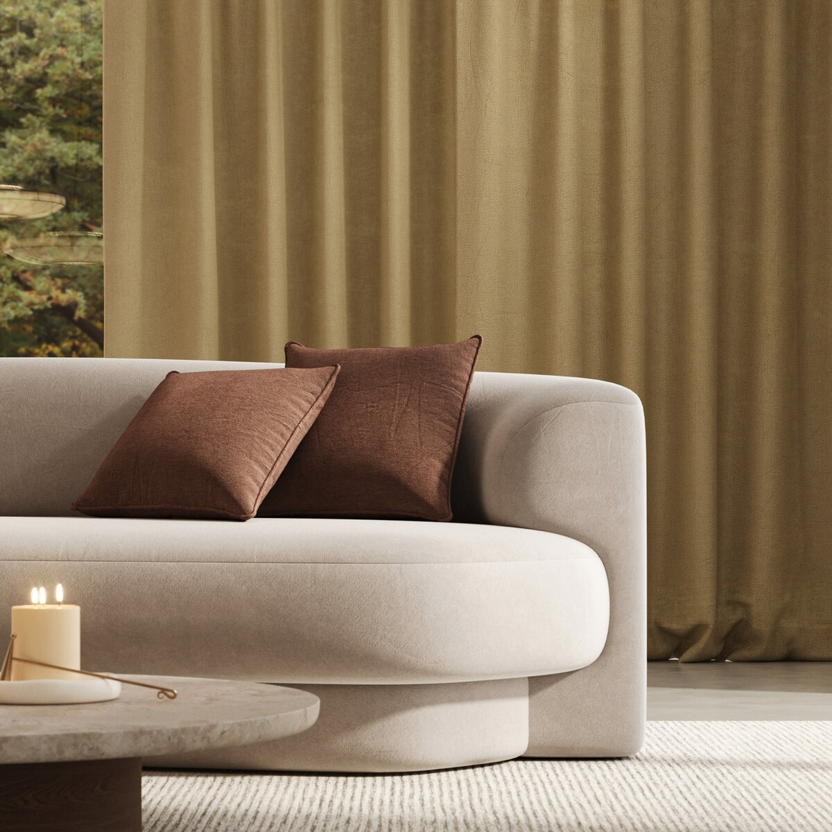 LILA kommt in Pure White, Chalk, Camel, Hazelnut, Sand und Burnt Sienna. Der Inbetween ist ein haptisches Erlebnis in sechs geerdeten Tönen. Megasoft in Griff und Fall, ein Traum zum Dekorieren. Grün ist LILA außerdem, da sie aus 100 % natürlichen Materialien besteht. Die hochwertige Leinenfaser ist ein Natur-Rohstoff, ohne künstliche Bewässerung in Europa angebaut und garantiert frei von Genveränderungen. Auch Lyocell ist komplett biologisch abbaubar und eine der nachhaltigsten Viskosefasern mit tollen Eigenschaften: Die Faser mit glatter Oberfläche und seidigem Griff wärmt nahezu wie Schurwolle und kühlt ähnlich wie Leinen. Da sie mehr Feuchtigkeit aufnimmt als Baumwolle, sorgt sie nebenbei für ein gesundes Raumklima.