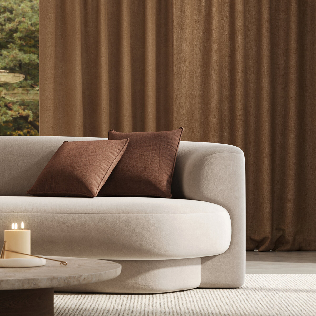 LILA kommt in Pure White, Chalk, Camel, Hazelnut, Sand und Burnt Sienna. Der Inbetween ist ein haptisches Erlebnis in sechs geerdeten Tönen. Megasoft in Griff und Fall, ein Traum zum Dekorieren. Grün ist LILA außerdem, da sie aus 100 % natürlichen Materialien besteht. Die hochwertige Leinenfaser ist ein Natur-Rohstoff, ohne künstliche Bewässerung in Europa angebaut und garantiert frei von Genveränderungen. Auch Lyocell ist komplett biologisch abbaubar und eine der nachhaltigsten Viskosefasern mit tollen Eigenschaften: Die Faser mit glatter Oberfläche und seidigem Griff wärmt nahezu wie Schurwolle und kühlt ähnlich wie Leinen. Da sie mehr Feuchtigkeit aufnimmt als Baumwolle, sorgt sie nebenbei für ein gesundes Raumklima.