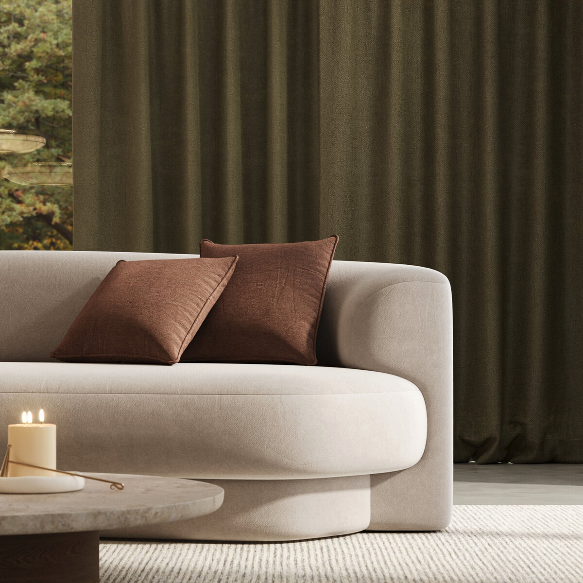 LILA kommt in Pure White, Chalk, Camel, Hazelnut, Sand und Burnt Sienna. Der Inbetween ist ein haptisches Erlebnis in sechs geerdeten Tönen. Megasoft in Griff und Fall, ein Traum zum Dekorieren. Grün ist LILA außerdem, da sie aus 100 % natürlichen Materialien besteht. Die hochwertige Leinenfaser ist ein Natur-Rohstoff, ohne künstliche Bewässerung in Europa angebaut und garantiert frei von Genveränderungen. Auch Lyocell ist komplett biologisch abbaubar und eine der nachhaltigsten Viskosefasern mit tollen Eigenschaften: Die Faser mit glatter Oberfläche und seidigem Griff wärmt nahezu wie Schurwolle und kühlt ähnlich wie Leinen. Da sie mehr Feuchtigkeit aufnimmt als Baumwolle, sorgt sie nebenbei für ein gesundes Raumklima.