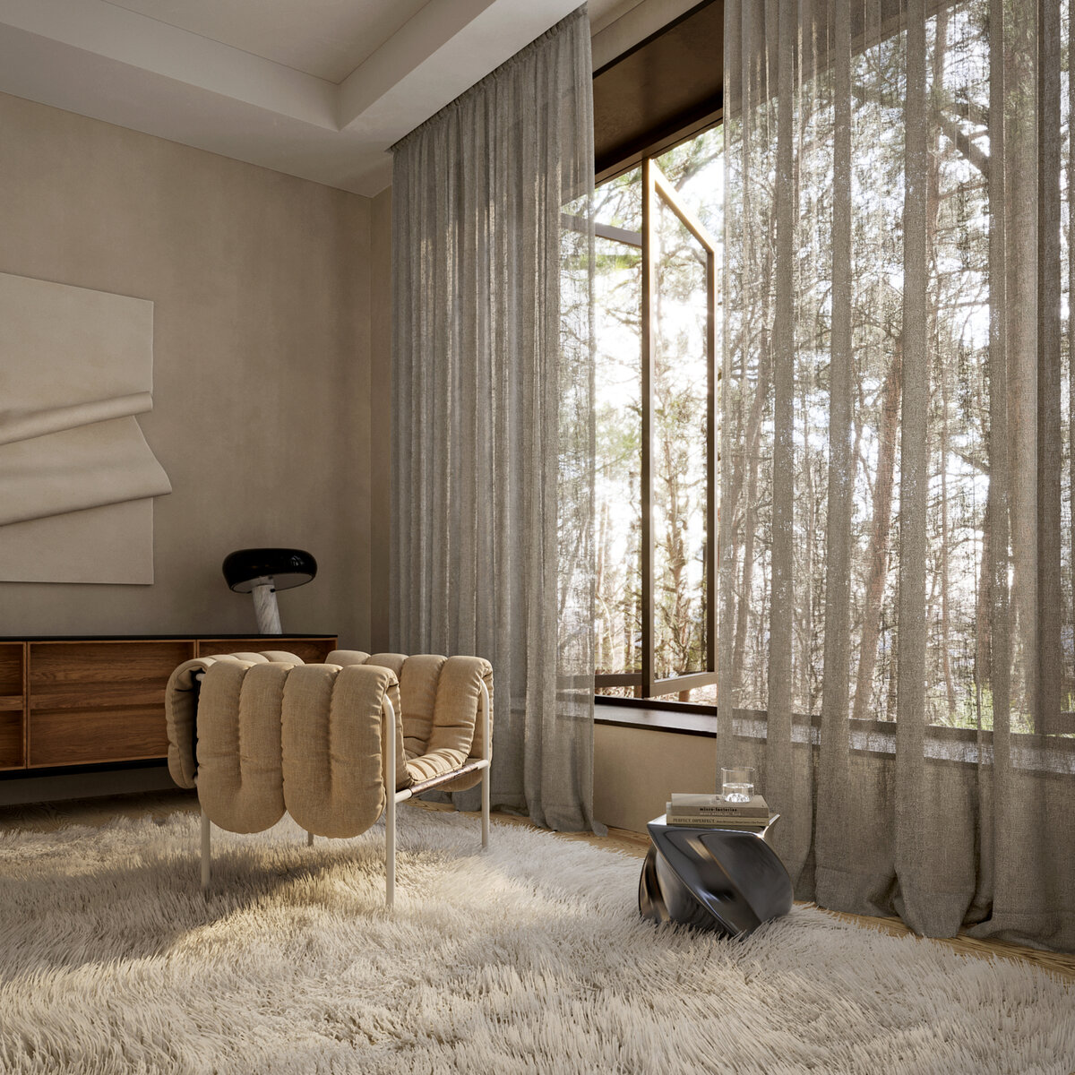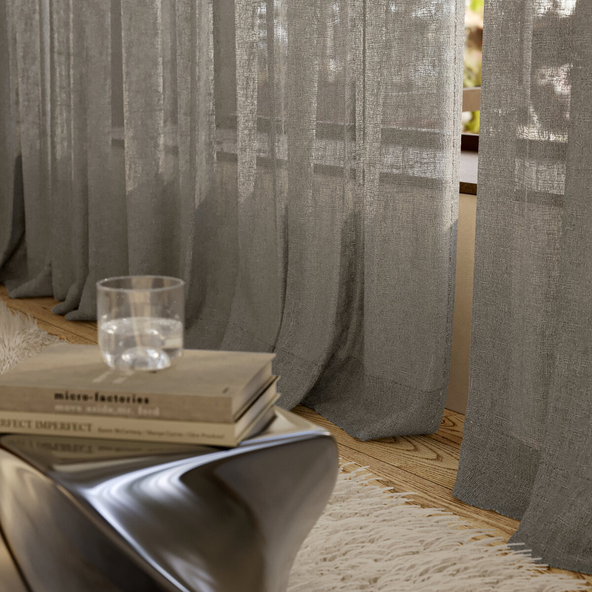 Ooh OOLONG! Dramatisch schön inszeniert das Sonnenlicht die raue und natürliche Struktur des Transparentstoffes. So kommt nicht nur OOLONGs eigene Materialität von 53 % BCI Cotton und 42 % recyceltem Polyester 100 %-ig zur Geltung, sondern auch die der umliegenden Architektur aus Beton, Stahl, Holz oder Glas. Die charaktervolle Wirkung gibt es in naturbetonten Farben.