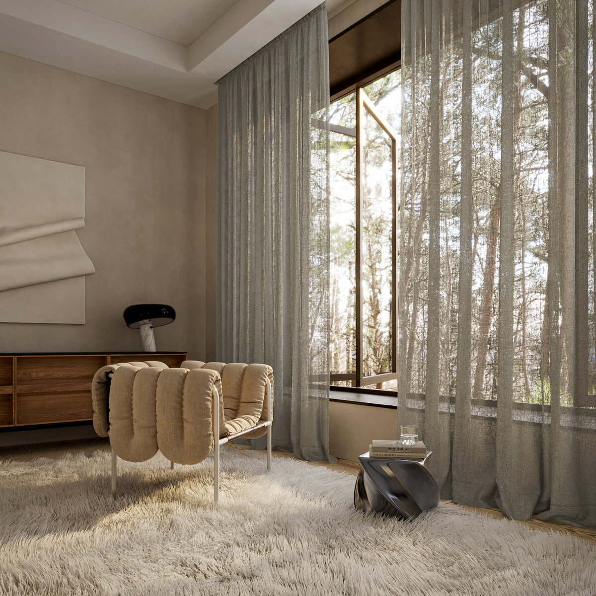 Ooh OOLONG! Dramatisch schön inszeniert das Sonnenlicht die raue und natürliche Struktur des Transparentstoffes. So kommt nicht nur OOLONGs eigene Materialität von 53 % BCI Cotton und 42 % recyceltem Polyester 100 %-ig zur Geltung, sondern auch die der umliegenden Architektur aus Beton, Stahl, Holz oder Glas. Die charaktervolle Wirkung gibt es in naturbetonten Farben.