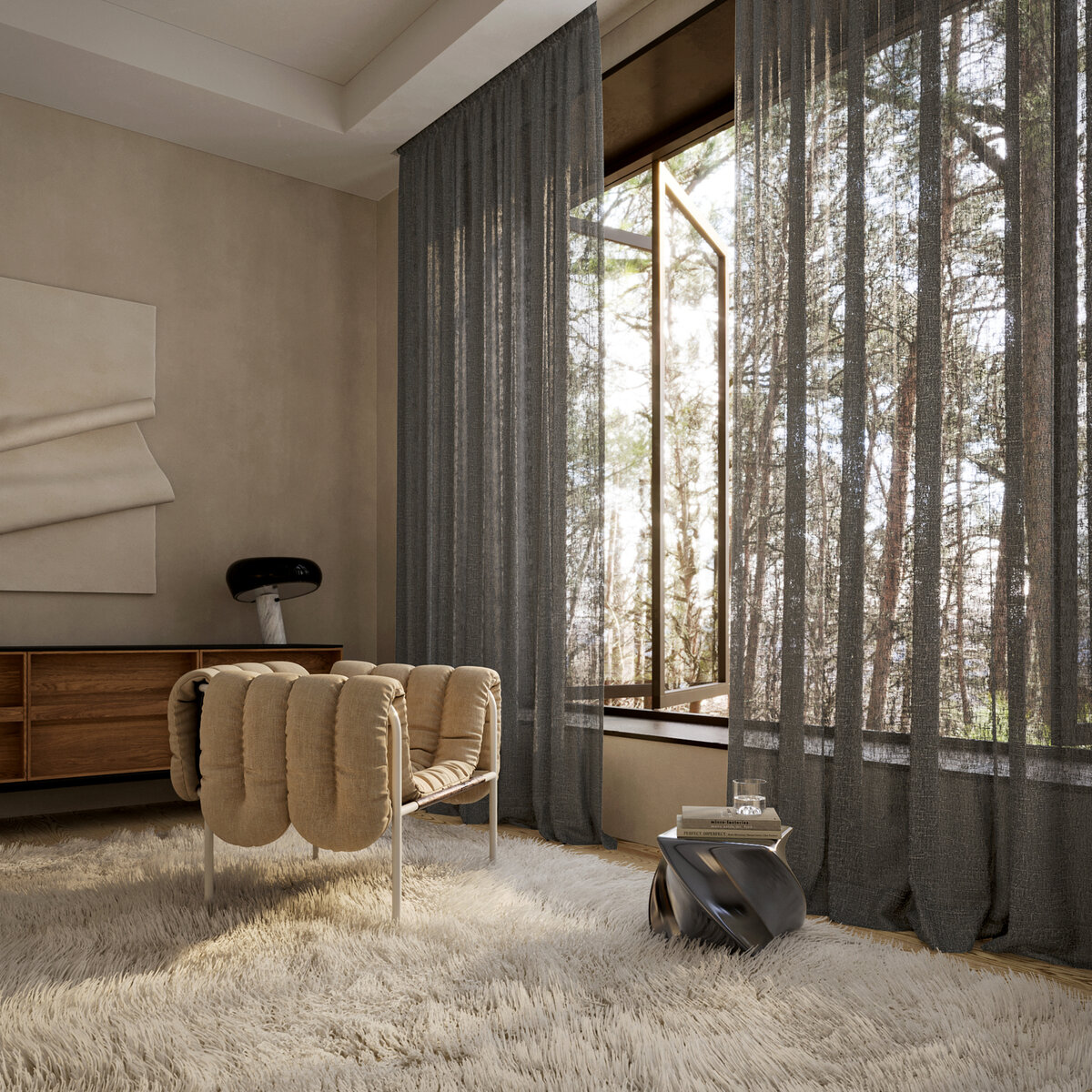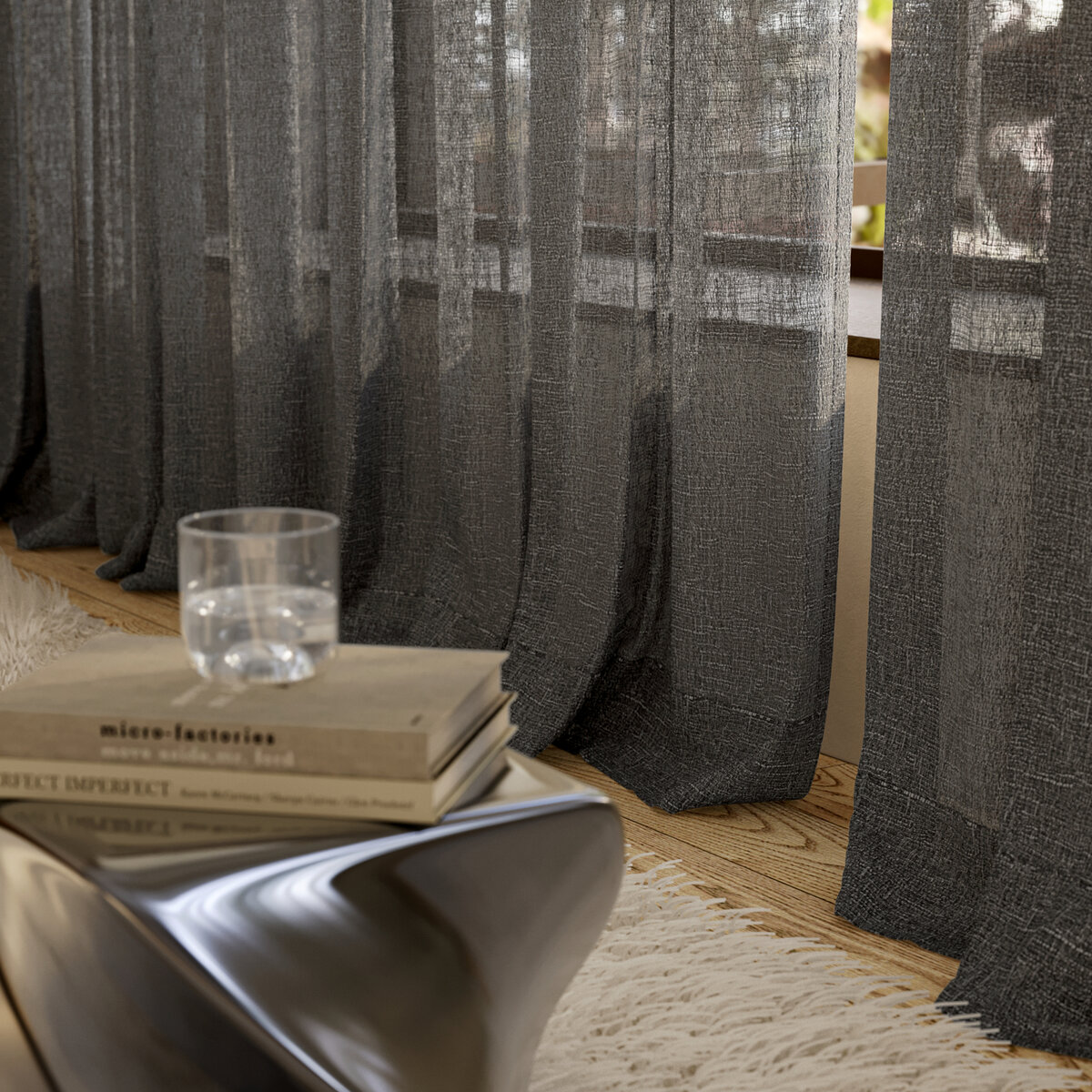 Ooh OOLONG! Dramatisch schön inszeniert das Sonnenlicht die raue und natürliche Struktur des Transparentstoffes. So kommt nicht nur OOLONGs eigene Materialität von 53 % BCI Cotton und 42 % recyceltem Polyester 100 %-ig zur Geltung, sondern auch die der umliegenden Architektur aus Beton, Stahl, Holz oder Glas. Die charaktervolle Wirkung gibt es in naturbetonten Farben.