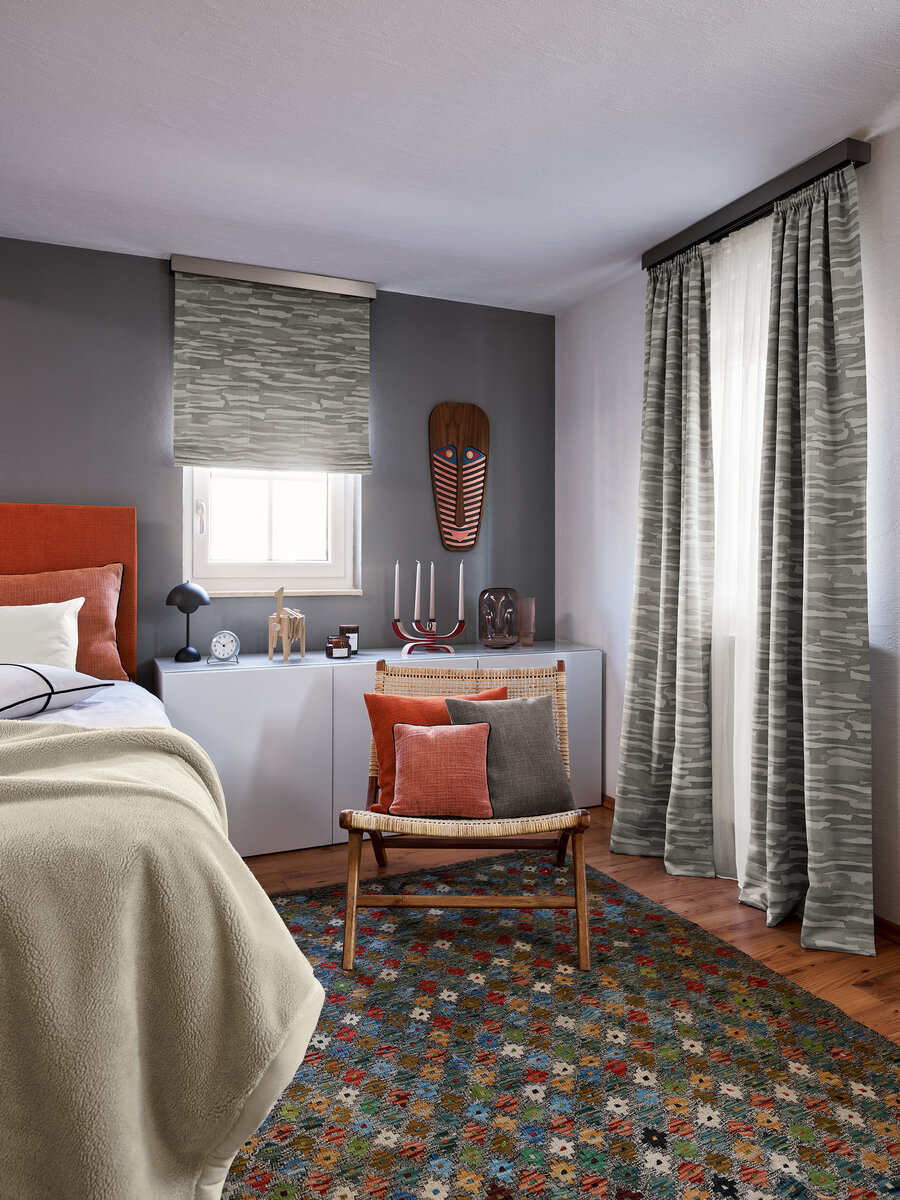 PER belebt dein Zuhause mit Dynamik. Sein plakatives, horizontal geflecktes Design erinnert in Blautönen an rauschende Wellen, wird in erdigen Tönen zur Natursteinmauer, in weiß zur Winterlandschaft. Ein chamäleonartiger Charakter mit beständigen Eigenschaften: ob weicher Griff, Pflegleichtigkeit, schwere Entflammbarkeit, thermische Funktionen oder Abdunklungseffekt.