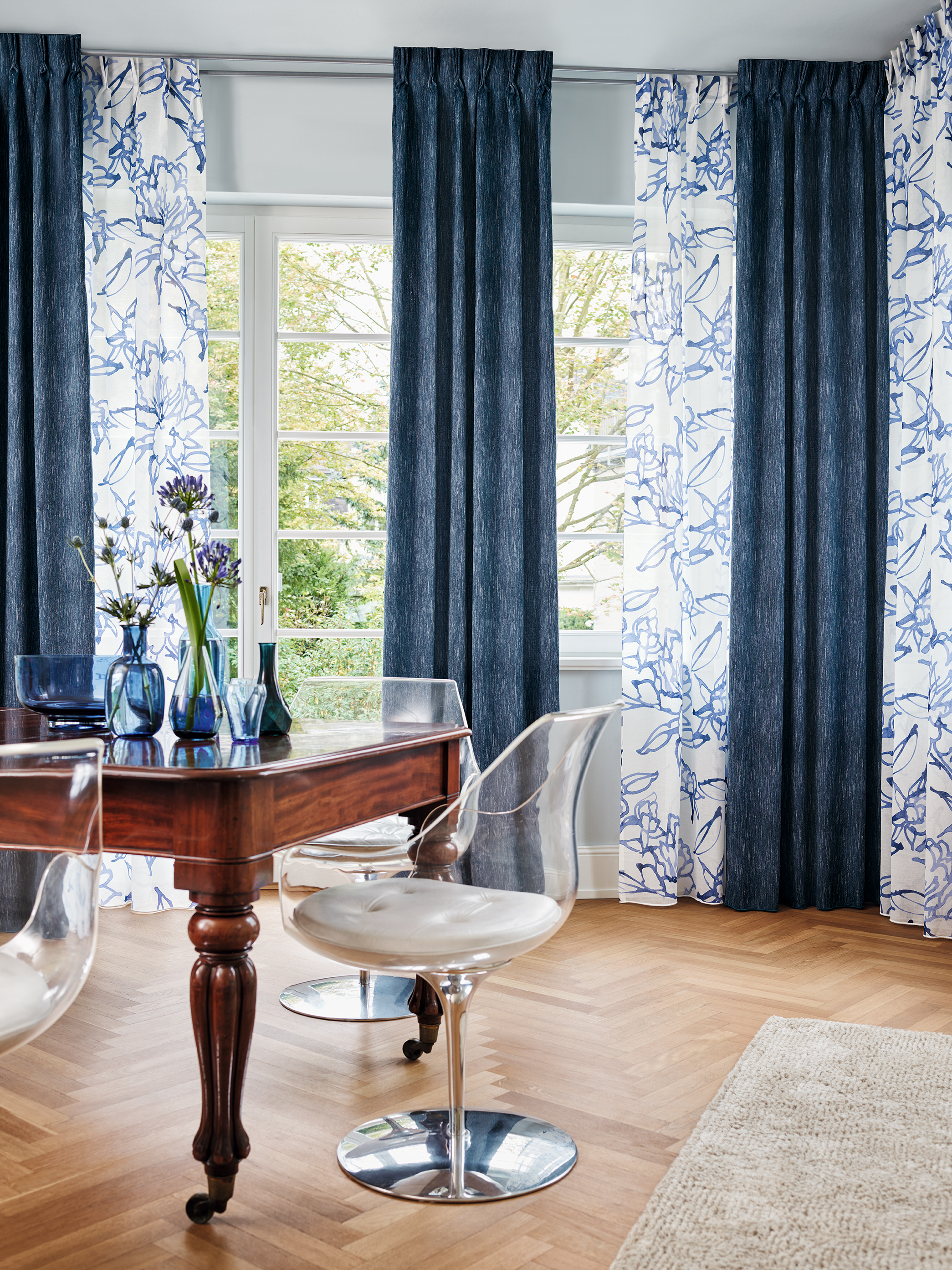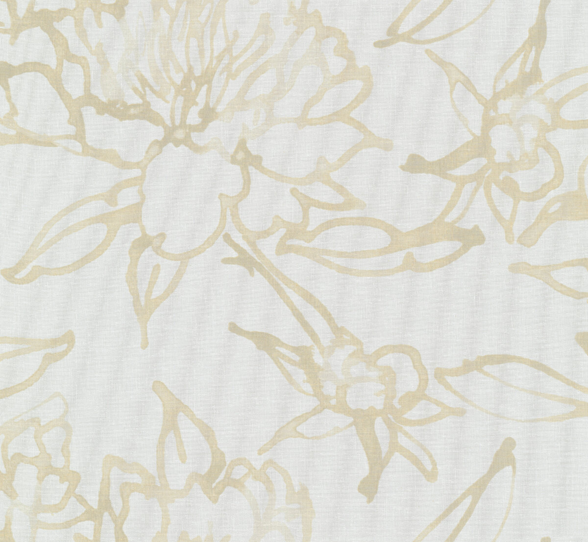 Eine Batik-Blume verströmt Zeitgeist. Die transparente Grundware mit feiner handwerklicher Struktur lässt den kunstvollen Batikdruck auf TINT hervorragend zur Geltung kommen. Das Aquarelldesign auf dem ruhigen Fond bringt so die Batikfarben Blau, Grün, Grau und Beige samt Betrachter zum Strahlen.