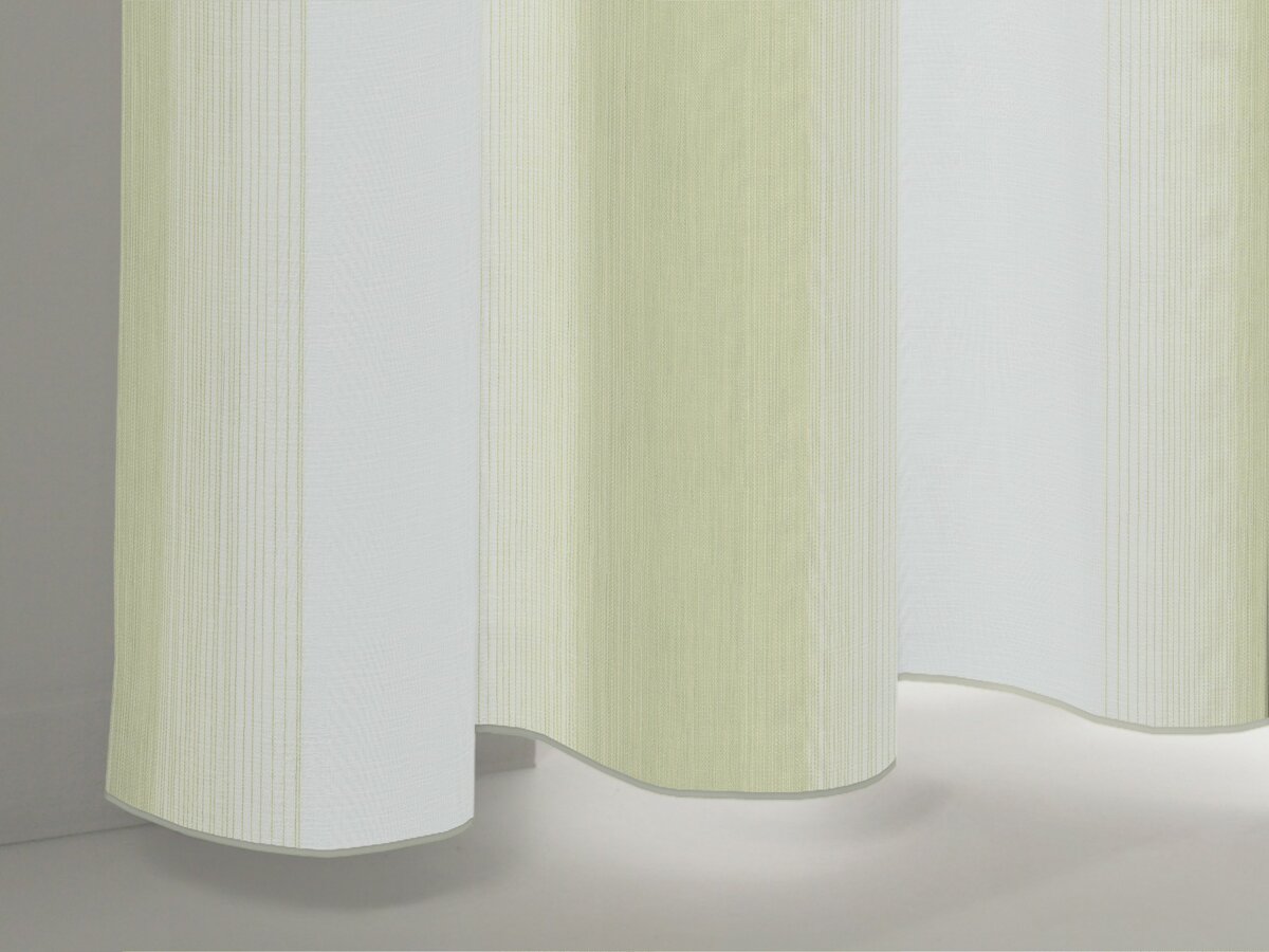 Auch hier liefert LINTO den unifarbenen Fond, den VIA mit einem großzügigen Streifen-Effekt versieht. Feine Linien verdichten sich zum Zentrum des Streifens und spielen so geschickt mit Transparenz und Dichte – in zwölf Farben von klassischem Schwarz-Weiß bis zu frischen Sonnen-, Wasser- und Wiesentönen.