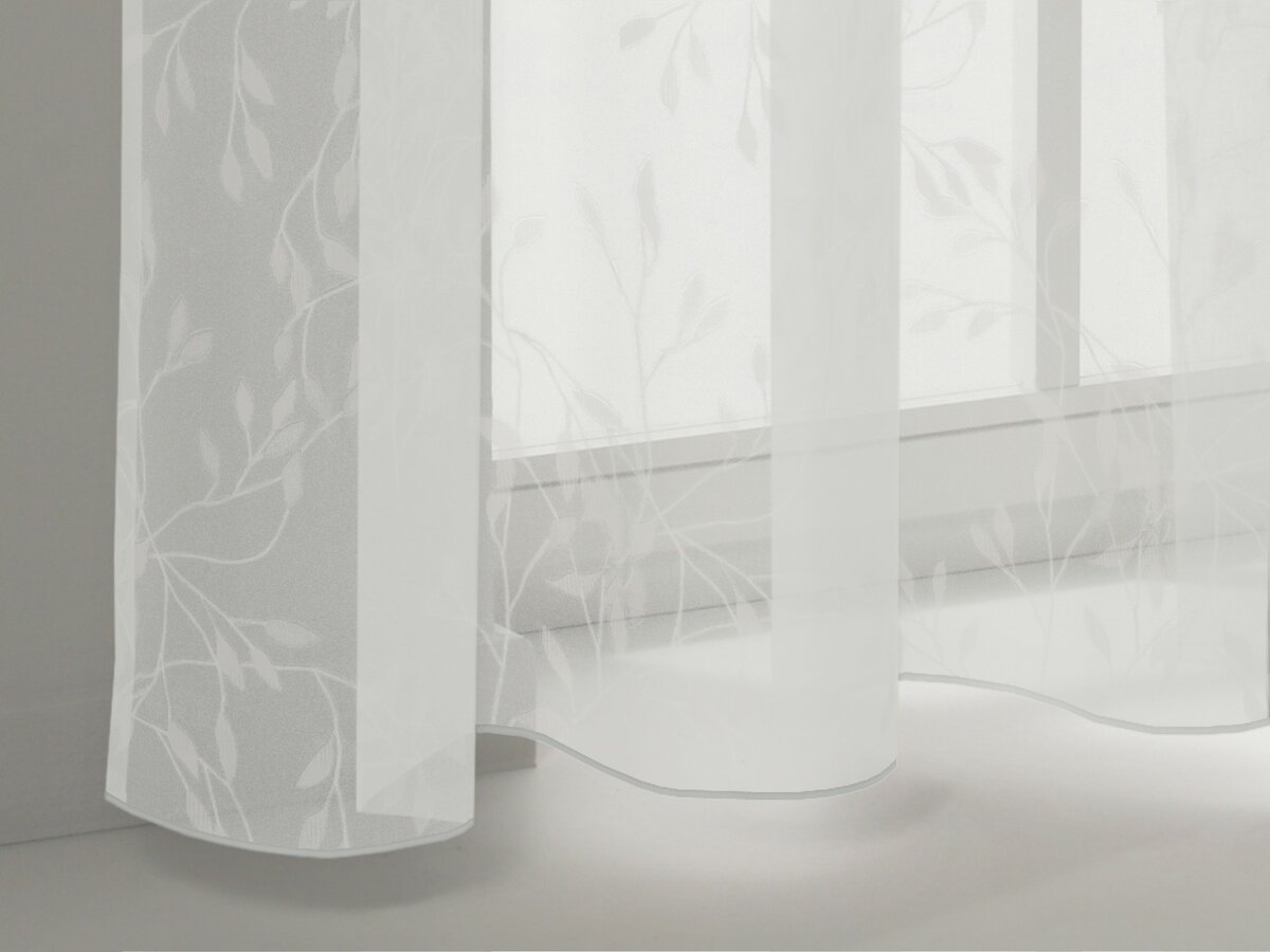 A transparent background featuring a lavish burn out pattern with spiralling opaque blossoms patterned internally with stripes. Available in a choice of white on white, beige and white, grey and white or green and white.