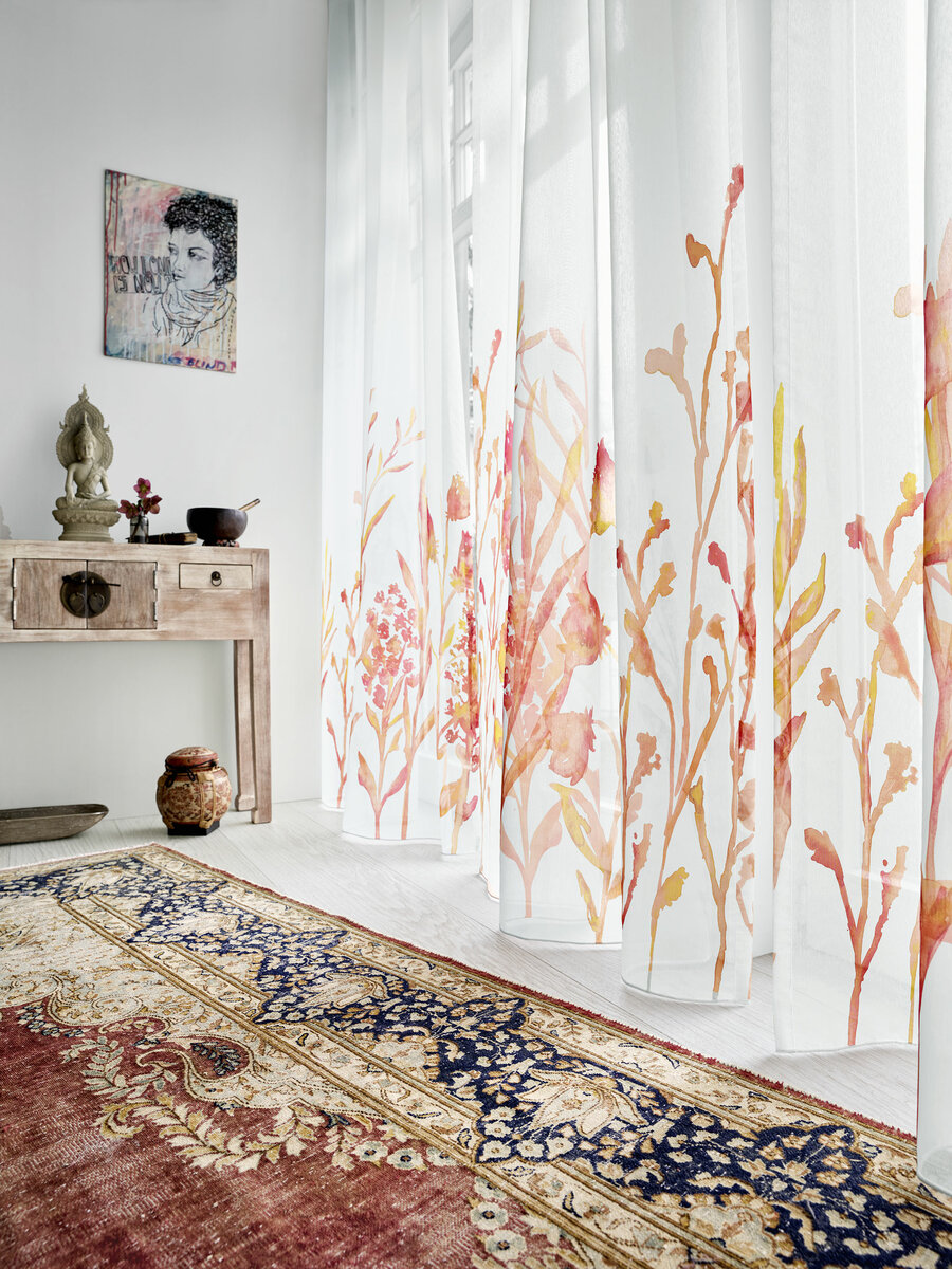 A lovely silhouette – the FLOYD transparent fabric has a blustery, cheerful appeal based on an interplay of light and shadow. A base design with a natural feel, it features dreamy watercolour artwork in the form of leaves and vines, perfectly digitally printed. This FLOYD isn’t pink – but it does incorpor ate green, aqua, earth tones and Indian summer red.
