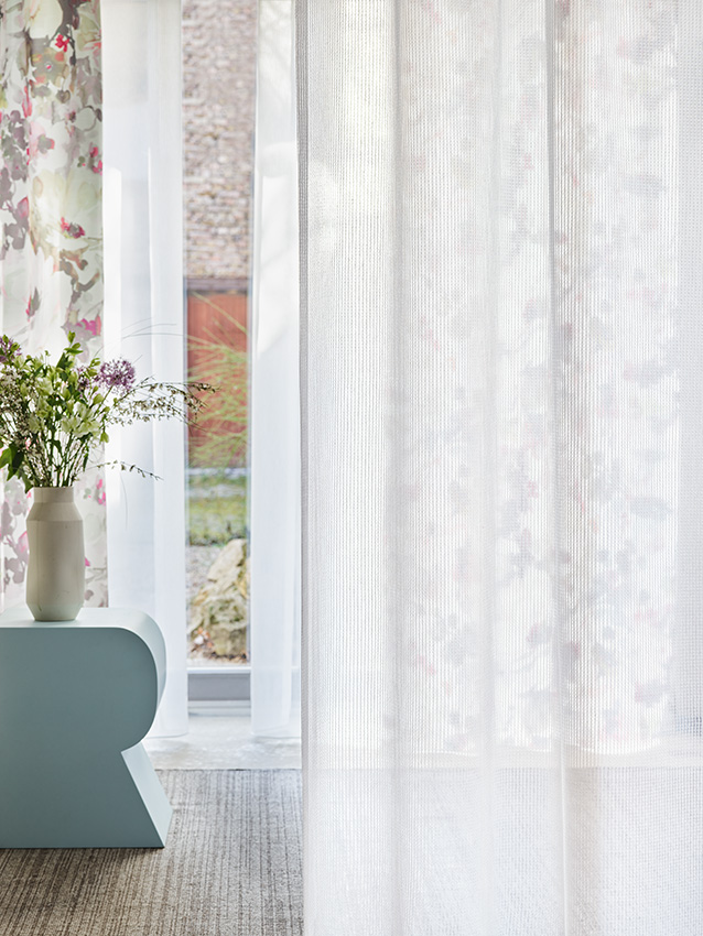 From delicate sand dunes, to gentle waves or natural wooden structures – any number of patterns can be identified in the vertical wave-like lines of the elegant transparent fabric GEORGE. It looks great on its own or in combination with other patterned or single-colour decorative fabrics. Either way, you will always be on the same wavelength with GEORGE.