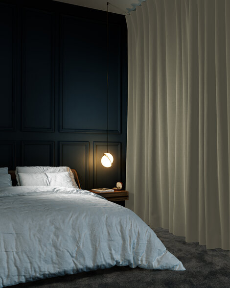 IMPULSE is a wonderful voluminous curtain fabric with sleep factor guaranteed. Thanks to its dimout character the prerequisites for restful sleep are ensured and its acoustic and thermal properties ensure a calm and cozy atmosphere. Sweet dreams!