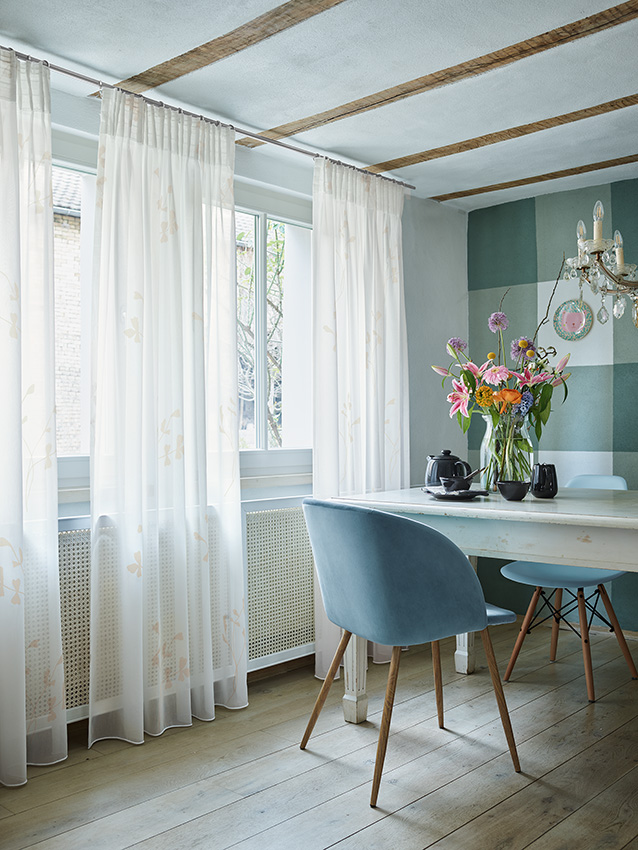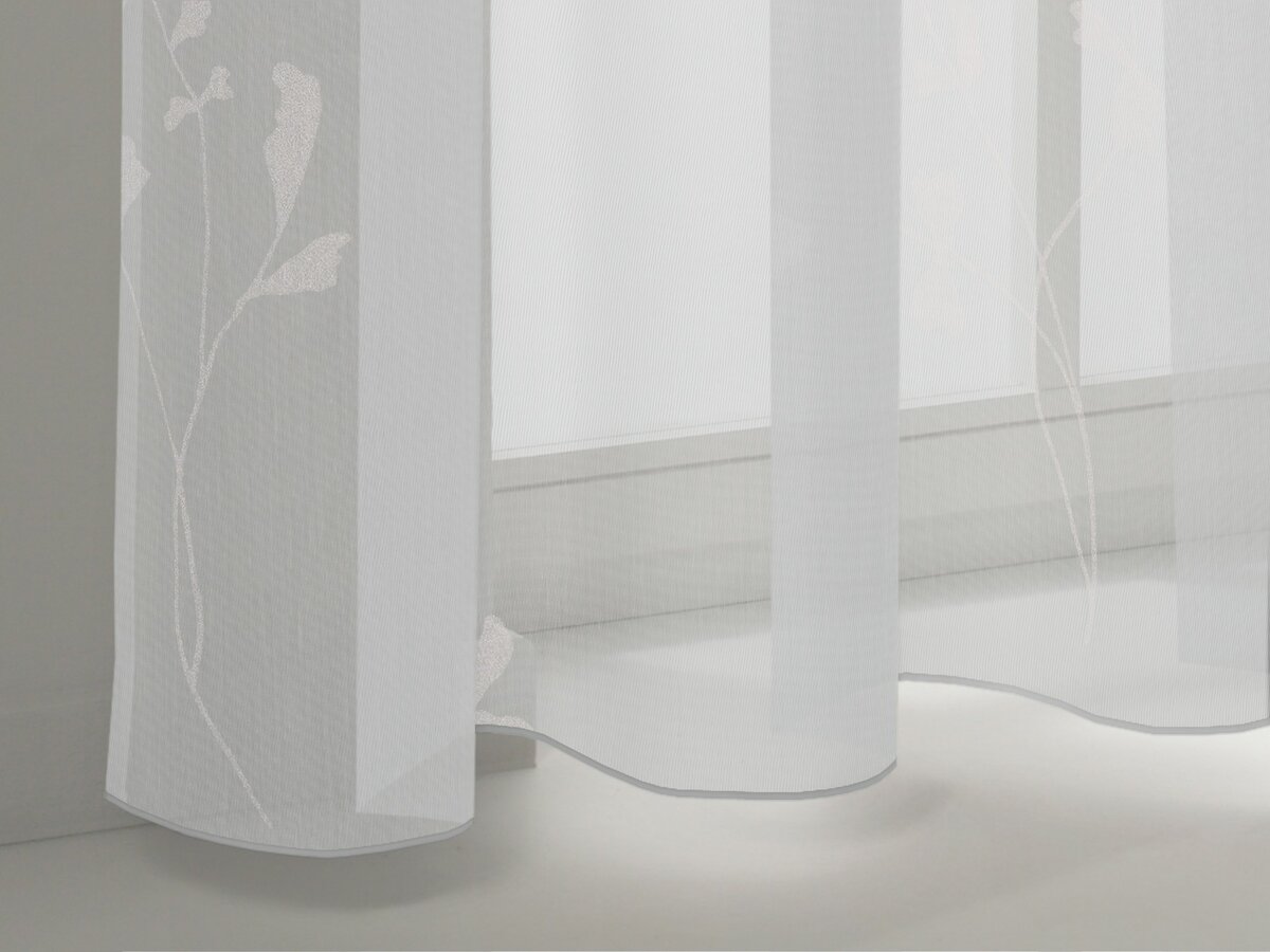 JENNIFER is delicate, feminine and timeless. Its light tones, soft material and minimalistic design give it a pleasant, airy feel. The watercress pattern in a white pigment print stands out against its greige and white background. The beige print, with its ecru-coloured, soft-flowing and low-maintenance background, blends harmoniously into any home.