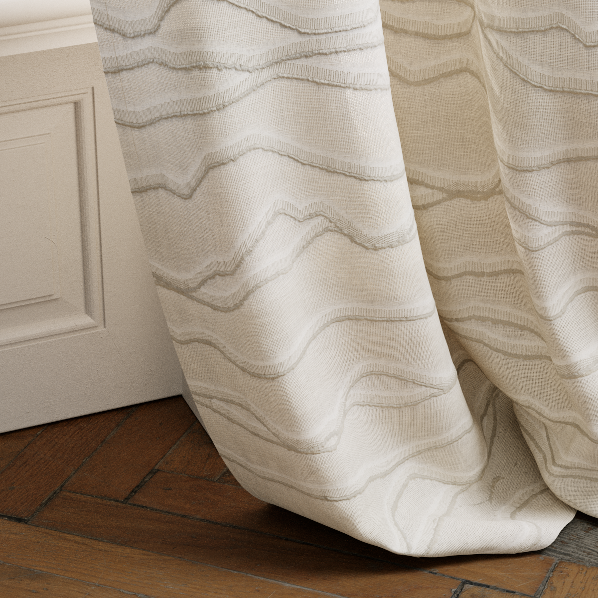 MONTARA blends craftsmanship with airy, alpine charm. Jute fil coupé waves echo mountain landscapes, rustic yet refined. The contrast between natural jute and a delicate transparent ground creates a balance of authenticity and elegance. In shades from winter white to soft linen, MONTARA brings nature home — distinctive and warm.