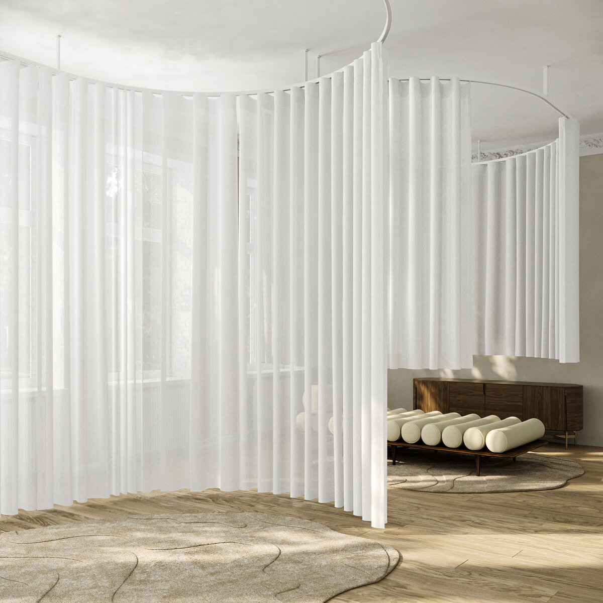 Three-dimensional fabric that is subtle and voluminous. The harmonious texture of our NOE fabric creates an atmosphere of serenity in any room. The airflow finish gives the transparent fabric softness and volume. Other key features include the 3D weaving technique, recycled polyester, and the easy-care experience.
