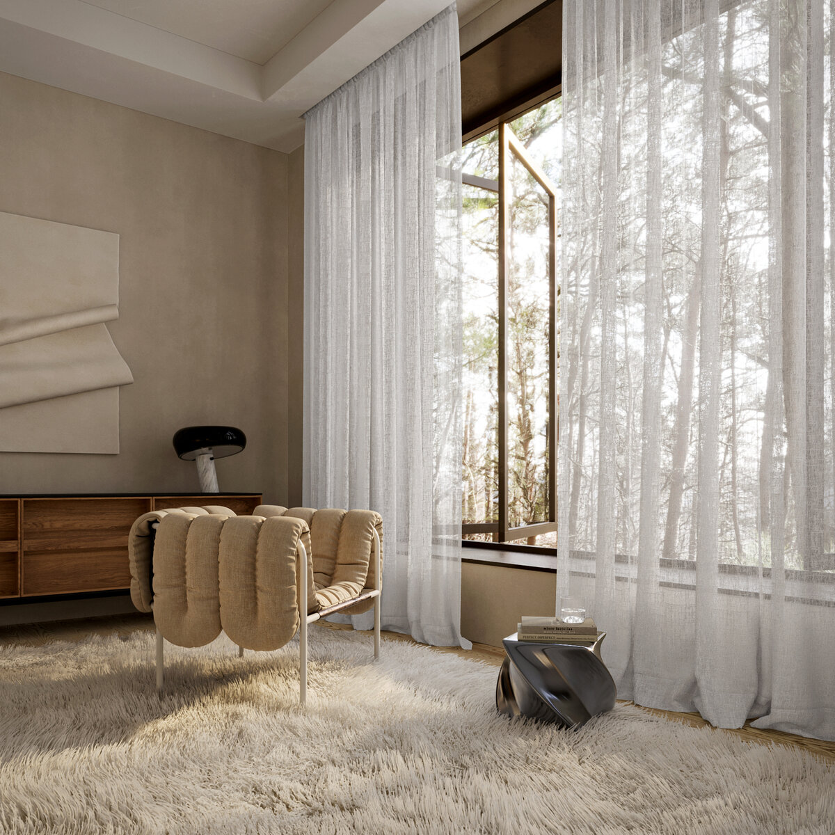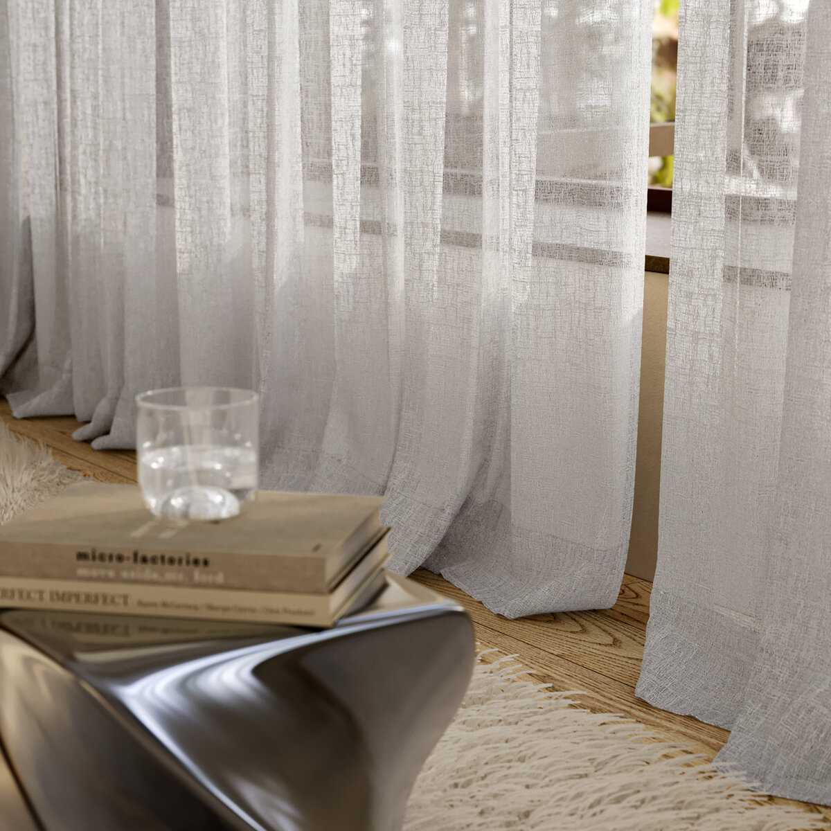 Ooh OOLONG! This sheer fabric’s raw, natural texture is beautifully dramatized by sunlight. In these moments, OOLONG’s own materiality – a blend of 53% BCI cotton and 42% recycled polyester – is revealed in all its splendor, underscoring the surrounding architecture of concrete, steel, wood, and glass. The natural tones further emphasize the unique character of this fabric.