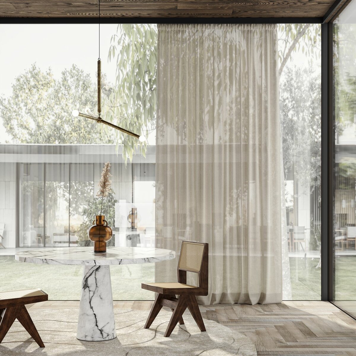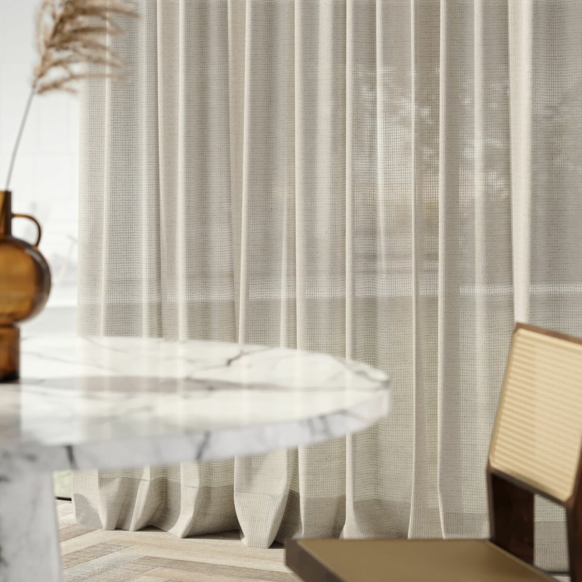 Semifreddo, with its soft pastel colors and unique net structure, adds a relaxed vibe to any room. A blend of 97% polyester and 3% linen, this fabric offers delightful transparency and a casual, light drape.