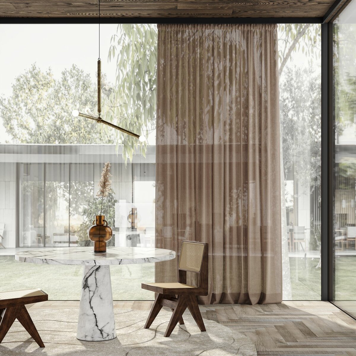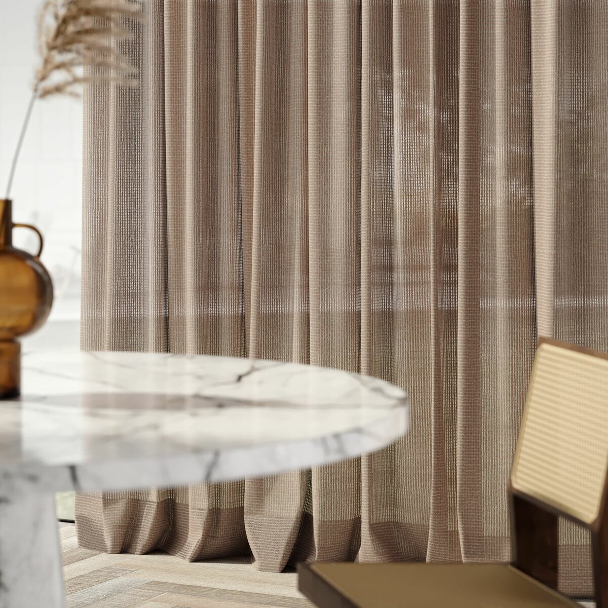 Semifreddo, with its soft pastel colors and unique net structure, adds a relaxed vibe to any room. A blend of 97% polyester and 3% linen, this fabric offers delightful transparency and a casual, light drape.
