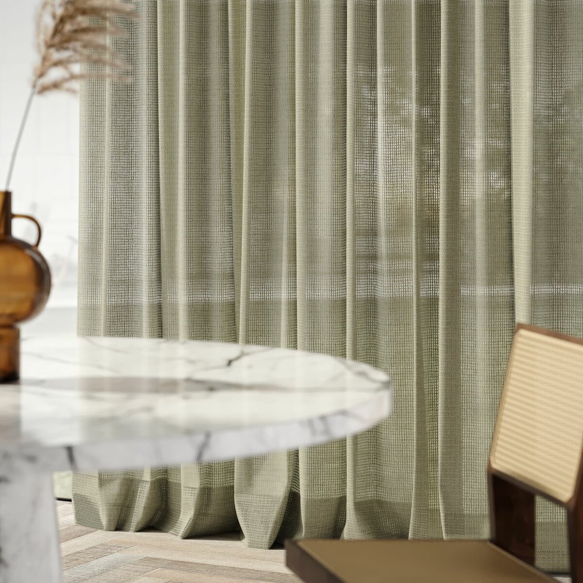 Semifreddo, with its soft pastel colors and unique net structure, adds a relaxed vibe to any room. A blend of 97% polyester and 3% linen, this fabric offers delightful transparency and a casual, light drape.