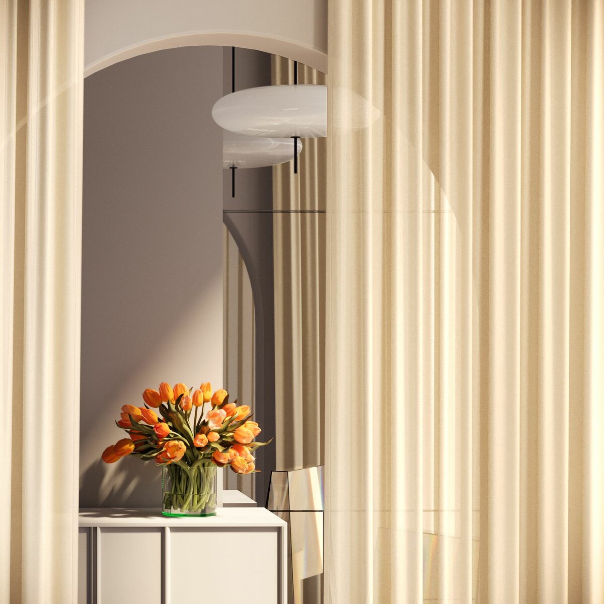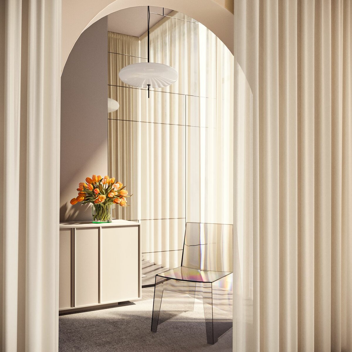 Silky Sorbet, with its transparent, crash-like texture and delicate pastel shades, brings gentle movement and femininity to any room. Made from recycled fibres, it combines sustainability with modern elegance, perfect for relaxed, flowing drapes.
