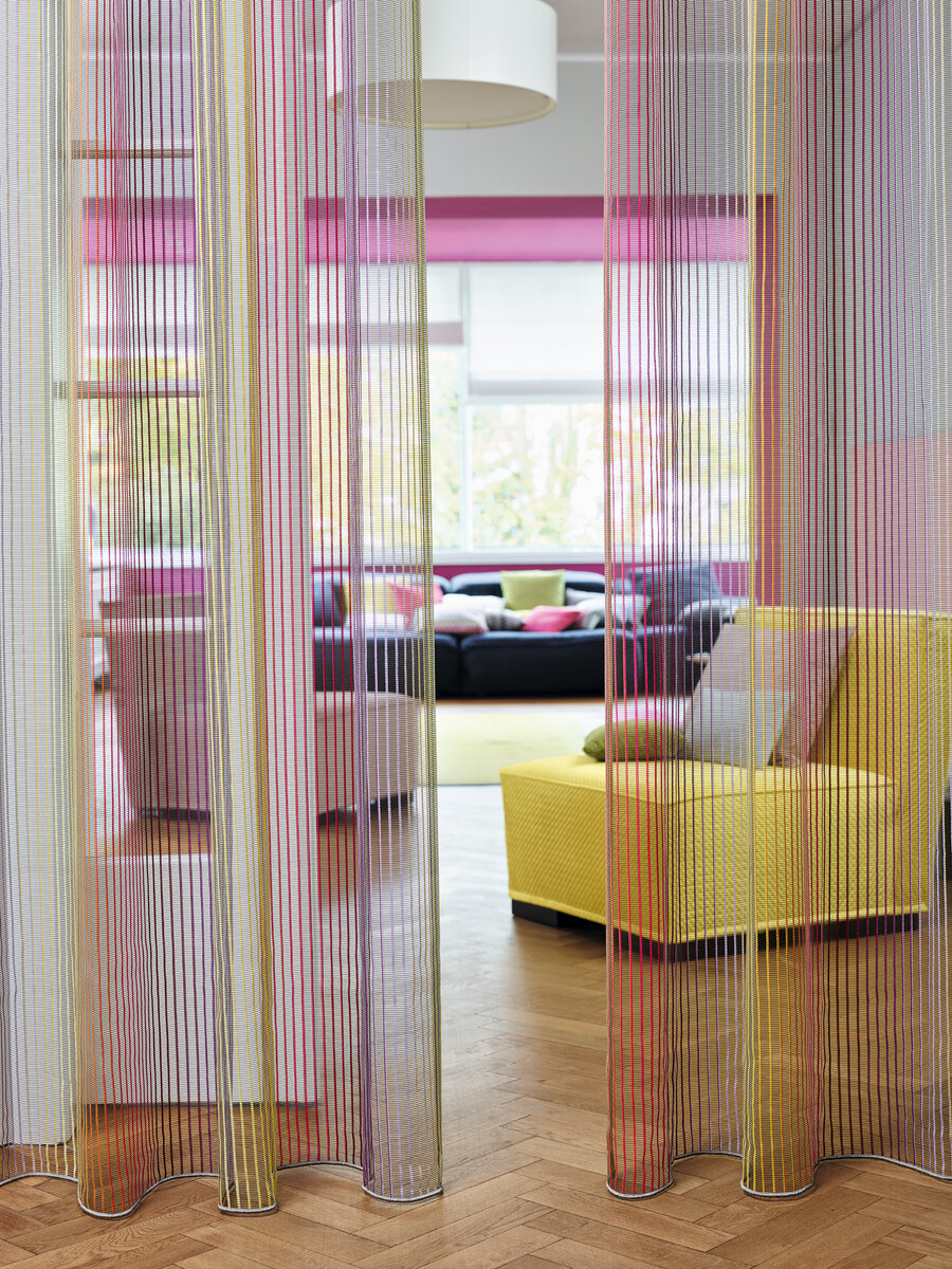 Somewhere over the rainbow with SKADI! This leno weave features bold, cheerful colour gradients, which resonate with its modern elegance. This highly transparent base fabric, which has dense, balanced stripe detailing, reflects aspects of the natural world. Delicately harmonious colour combinations on a white background are juxtaposed with vibrant colours on a dark background.