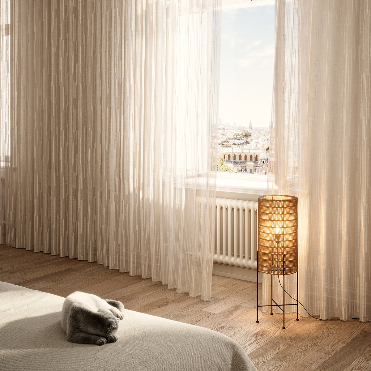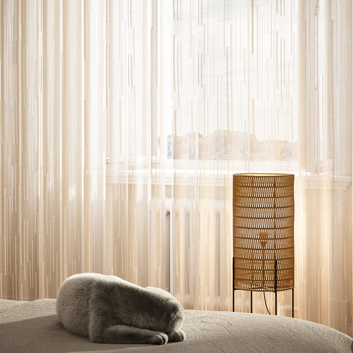 TALISMAN is a real lucky charm for your windows. Whether in the living and dining area, bedroom, bathroom or kitchen, this fabric is ideal as both a curtain and a roller blind. The natural and handcrafted transparent look in neutral colors will raise a smile wherever you use it. Its charming choreography of imperfection, three-dimensionality and mélange combined with the super soft haptics will enrich any interior style.