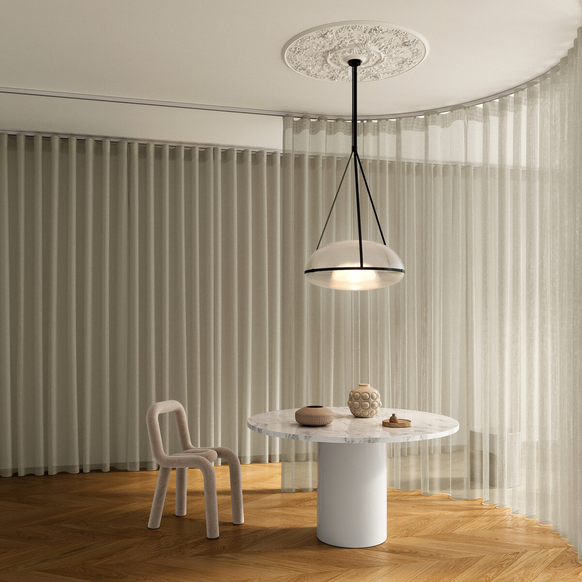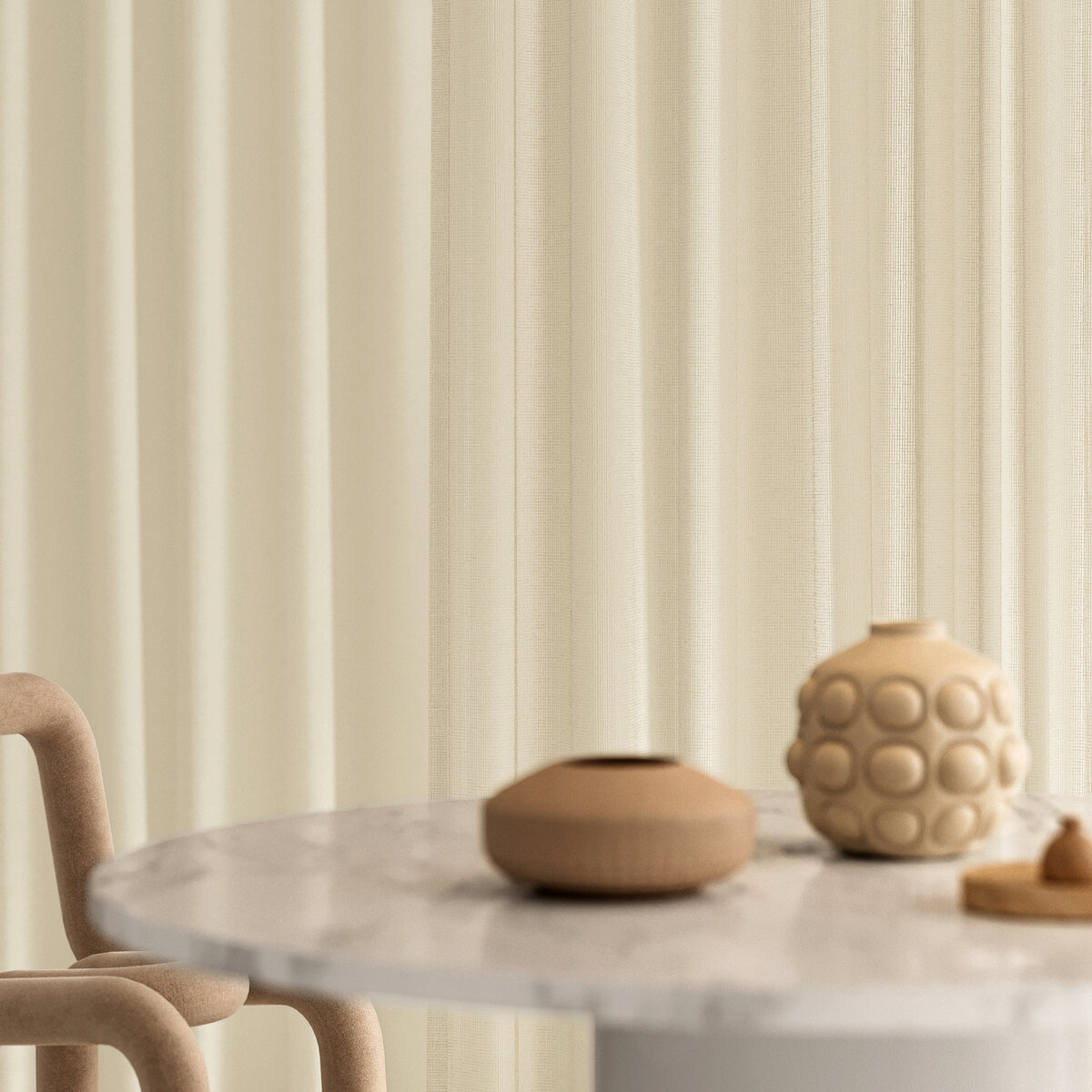 VITRUV is architecture in fabric. Clear in form, function, and focus, its architectural look in a choice of 10 trendy colors will make a statement in any interior, whether at home, in the office or in a hotel. Outstanding: VITRUV can also be transformed into an iconic room divider in multiple layers and colors. In this context, the transparent, flame-retardant mesh fabric made from recycled polyester showcases its functional aesthetic. Why not try this fabric in your own home?