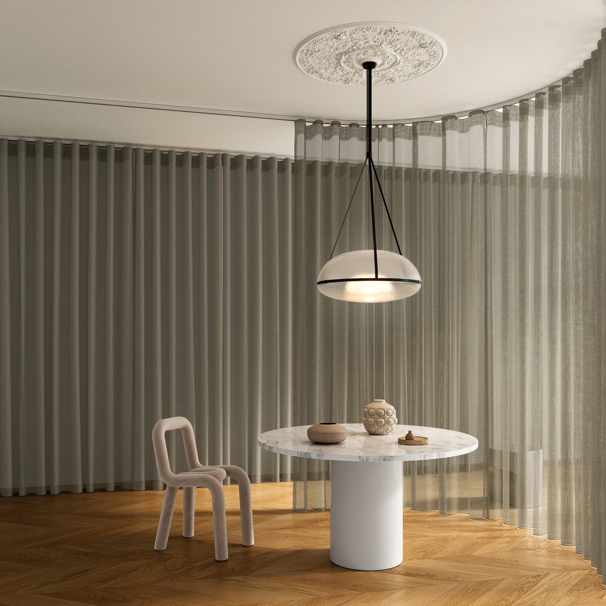VITRUV is architecture in fabric. Clear in form, function, and focus, its architectural look in a choice of 10 trendy colors will make a statement in any interior, whether at home, in the office or in a hotel. Outstanding: VITRUV can also be transformed into an iconic room divider in multiple layers and colors. In this context, the transparent, flame-retardant mesh fabric made from recycled polyester showcases its functional aesthetic. Why not try this fabric in your own home?